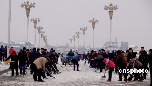 1月29日,湖南邵陽全體政府工作人員、公安、武警、交通、環、城管及部分青年志愿者組織共計三千余人奮戰在抗冰救災第一線,在市區資江二橋、西湖橋等險要路段開展了破冰行動,全力鏟冰除雪,恢復道路交通安全,將冰雪災害造成損失減少到最底。 受強冷空氣和西南暖濕氣流共同影響,邵陽地區從13日開始持續出現雨雪、冰凍、嚴寒天氣。1月28日邵陽市下了一場大雪,全市交通道路凍結、造成部分供水管道爆裂,電力設備停止運行、市汽車南、東、西站發往全省各地的汽車全部停開,市區幾條險要路段已實行交通管制禁止通行,給市民生活及交通運輸困難。中新社發 龔高翔 攝