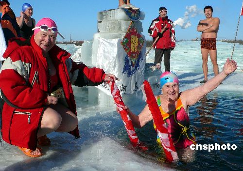 1月31日,黑龍江黑河30余名冬泳健兒與9名俄羅斯女冬泳運動員在中俄界江冒著零下30度嚴寒開展冬泳聯誼活動。據悉,89歲冬泳健將尼娜·加里寧娜曾經參加過俄羅斯納霍德卡市衛國戰爭。中新社發 邱齊龍 攝
