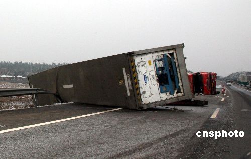 一場五十年罕見的陰雨雪冰凍災害天氣已導致江西省連日發生了多起車禍事故,1月23日以來發生了三起重大交通事故,導致十三人死亡。圖為31日江西省梨溫高速公路上兩輛大型客車相撞側翻。中新社發 吳慶才 攝