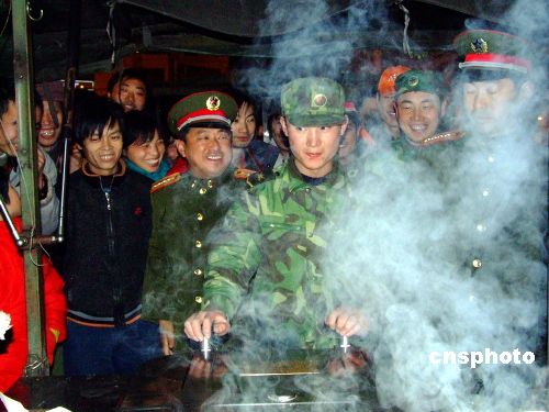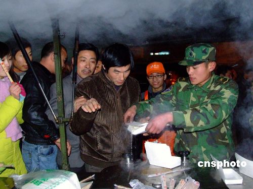 圖:南京軍區(qū)官兵為杭州滯留旅客送水餃