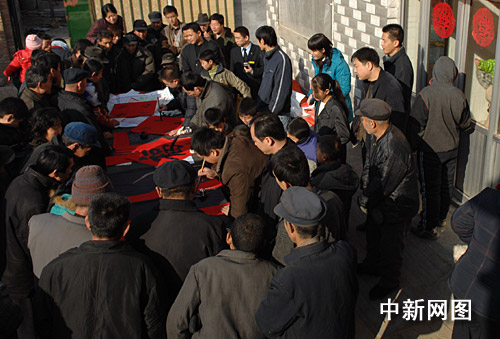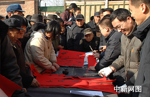 1月31日,河北滄州市部分書法家、企業(yè)家來到“感動(dòng)中國支教模范”白芳禮的家鄉(xiāng)滄縣白賈村,為鄉(xiāng)親們書寫春聯(lián)。王少華 攝
