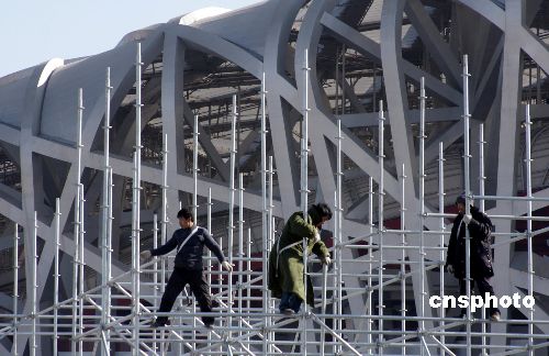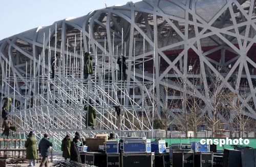 2月1日,工人在北京“鳥(niǎo)巢”奧運(yùn)工地搭設(shè)晚會(huì)舞臺(tái),迎接大年三十晚會(huì)到來(lái)。據(jù)了解,今年春節(jié)“鳥(niǎo)巢”工地將有五六百名工人堅(jiān)守在各自崗位上,這場(chǎng)晚會(huì)專門(mén)為他們準(zhǔn)備的。中新社發(fā) 吳芒子 攝
