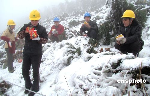 2月3日,電力工人在搶修110KV線路。1月17日以來,四川瀘州敘永遭遇百年不遇的雨雪冰凍災害,導致11萬千伏倒桿斷線2KM,10千伏斷線426KM,380伏斷線937KM,高壓倒桿142余根,低壓倒桿485余根,變壓器約25臺受損。為盡快搶通線路,電力工人們風餐露宿、加班加點。 中新社發 黃虎 攝