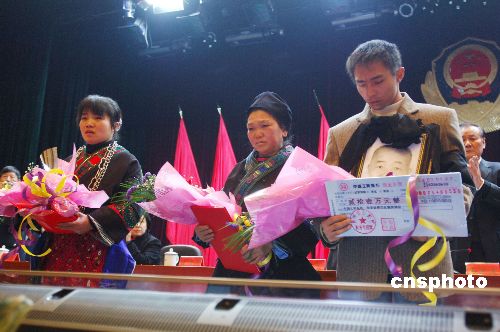 2月4日,貴州省委、省政府召開電視電話會議,表彰抗雪災犧牲在崗位上的民警歐光權。歐光權是貴州省臺江縣看守所民警,在抗雪災一線超負荷工作,1月21日因積勞成疾突發腦溢血倒在崗位上,經搶救無效光榮犧牲,終年57歲。2月2日,公安部部長孟建柱簽署命令,追授歐光權為全國公安二級英模。表彰會上有關領導一次性向歐光權的家屬頒發獎金21萬元。中新社發 吳東俊 攝