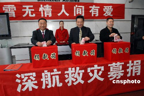 深圳航空公司二月四日發(fā)出緊急倡議,掀起“冰雪無(wú)情,人間有愛(ài)”賑災(zāi)捐款活動(dòng)。當(dāng)日下午,僅半小時(shí)首批員工捐款已達(dá)二十余萬(wàn)元人民幣。深航總裁李昆表示,我們的愛(ài)心行動(dòng)將繼續(xù)開(kāi)展下去,善款立即定向電匯貴州遵義、安順災(zāi)區(qū)。中新社發(fā) 陳文 攝