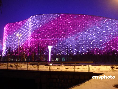 2008年2月6日晚,被稱(chēng)為蘇州“鳥(niǎo)巢”的蘇州科技文化藝術(shù)中心璀璨奪目,變幻多姿的燈飾絢麗迷人,營(yíng)造出濃厚的節(jié)日氣氛。中新社發(fā) 王建康 攝