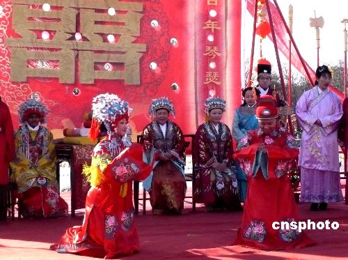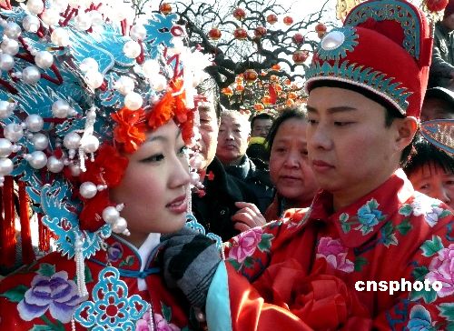2月8日,由北京大觀園主辦的2008年紅樓廟會吸引眾多游客,在廟會傳統的“元妃省親”古裝游行的盛大場景中,大觀園為《紅樓夢》一書中未能成婚的賈寶玉、林黛玉專門舉行一場別開生面的“寶黛成婚”場面,令游客耳目一新。中新社發 錢興強 攝