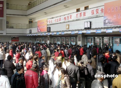 2月9日,蘇州火車站售票大廳內擠滿了排隊預購返程火車票的乘客。新的休假辦法的實行,春節后上班日期由以往的正月初八變更為初七,因此購票高峰也提前到來。當日,蘇州火車站售票大廳內人潮涌動,許多旅客紛紛提前購買返程火車票。中新社發 王建康 攝