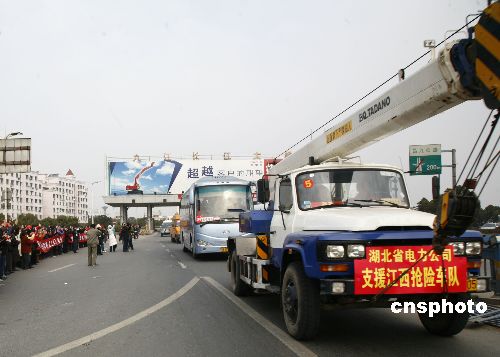 2月10日上午11時許,由171輛車組成的湖北支援江西電網的搶修車隊通過九江長江大橋抵達江西,搶修人員將趕赴咸夢線的搶修工地,修復咸夢線江西段134公里長受損電網。中新社發 shendudu 攝