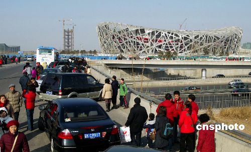2月10日,位于國家體育場--鳥巢南側(cè)的北辰橋上大批市民在拍照留念,造成北四環(huán)擁堵。因高架橋上視野開闊,角度頗佳,拍照者多將私家車隨意停在行車道上,嚴(yán)重影響其他車輛通行。北京交警隨后趕到將人群疏散,禁止后續(xù)車輛無故在此停靠。中新社發(fā) 富田 攝