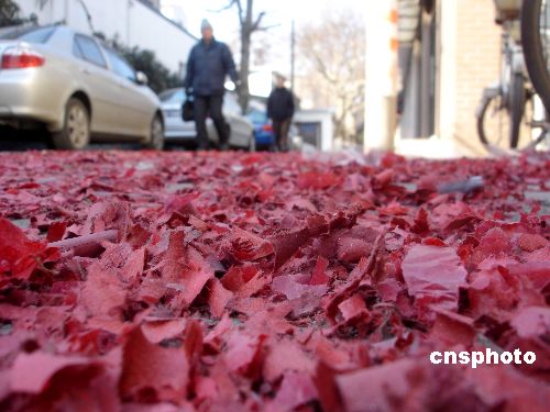2月13日是正月初七,蘇州許多商家在節后營業第一天燃放“開門炮”,許多街道上一地紙屑。 中新社發 王建康 攝