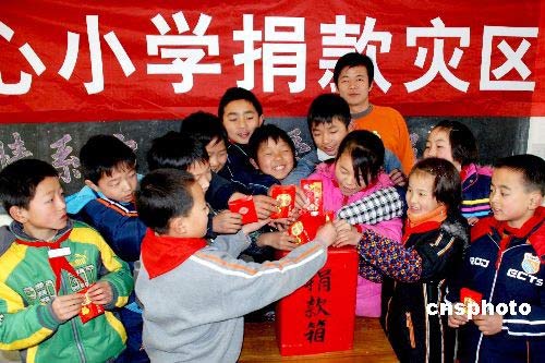 2月17日,婺源縣溪頭中心小學學生高舉自己的壓歲錢包,準備向災區進行募捐。當日,江西婺源縣中小學開學,該縣溪頭鄉小學組織全鄉小學生開展向災區捐款活動,該校500余名學生把新年壓歲錢拿出來,向遭受雪災的災區進行捐款。中新社發 王國紅 攝