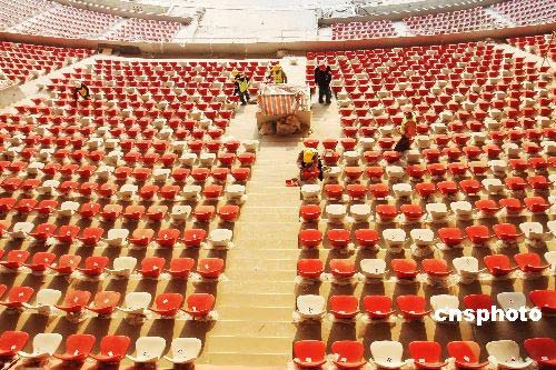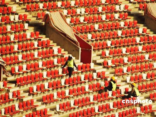 2月18日,工人們正在國家體育場“鳥巢”內清潔座椅。北京2008年奧運會主會場——國家體育場“鳥巢”8萬個固定座椅已于1月底安裝完工,這意味著北京國家體育場“鳥巢”的建設工程已接近尾聲。中新社發 鄭雄增 攝
