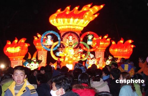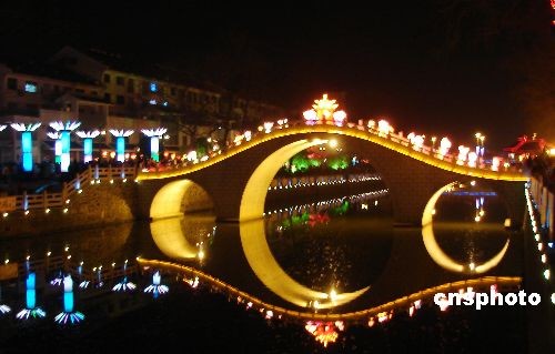2月19日,正月十三晚6時,江蘇儀征市華燈初放,古樓景觀區20多組彩燈在夜幕下交相輝映,顯得壯觀艷麗。當晚儀征市10多人涌向燈展區觀燈。中新社發 黃建林 攝