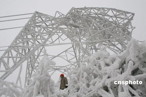 2月23日,全國第一條因暴雪災害,導致輸電線路鐵塔倒塌的三峽電力送往華東的大動脈±500千伏湖北宜昌至上海華新直流輸電線路,安徽境內搶修工作全部接束,中斷37天的500千伏宜華線恢復貫通。1月17日,該輸電線路﹟1146-﹟1153段4座位于大別山腹地安徽六安境內崇山峻嶺中的巨型鐵塔被冰雪壓塌,線路嚴重受損。災害發生后,安徽省電力公司500多名搶險人員和當地數百干部群眾克服天寒地凍、山路陡峭等困難,奮力搶修,經過37天艱苦奮戰,運送搶險物資150多噸,終于將4座倒塌鐵塔重新修建完成,宜華線路全線貫通。中新社發 陳超平 攝