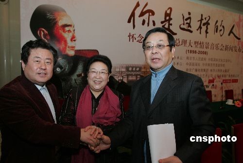 2008年3月5日是中國已故總理周恩來110周年誕辰,北京將舉辦系列紀念活動。2月25日下午,將于3月28日在北京人民大會堂舉行的大型情景音樂會《你是這樣的人》舉行新聞發布會,晚會總導演鄧在軍(中 周恩來侄媳)、藝術總監、中華民族文化促進會副主席曾慶淮(右)、節目總監、中國音樂家協會黨組書記徐沛東等出席。中新社發 任晨鳴 攝