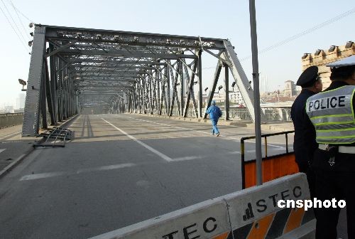 3月1日零時,上海外白渡橋準時封閉交通,它的整修工程也將隨之展開,擇日整體移入工廠進行大修。中新社發 湯彥俊 攝
