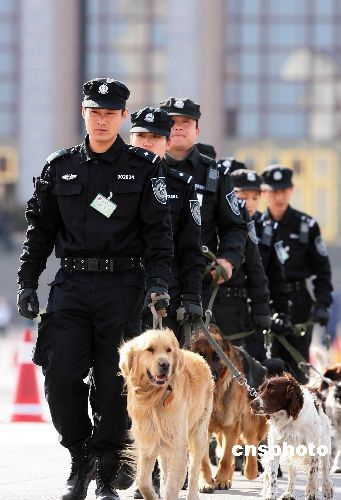 3月2日,全國政協(xié)第十一屆一次會議預備會議在北京人民大會堂舉行,安保人員攜警犬在天安門廣場巡邏,以確保會議順利進行。中新社發(fā) 盛佳鵬 攝