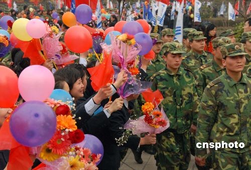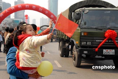 2008年3月5日,貴陽市人民廣場,援黔抗凝凍部隊返程受到社會各界人民群眾夾道歡送。據悉,貴州省在受凝凍災害期間,得到中國人民解放軍及社會各界的援助,電力搶修按預期提前190余天完成,目前貴州送往省外的電路全部投入送電。中新社發 張天林 攝