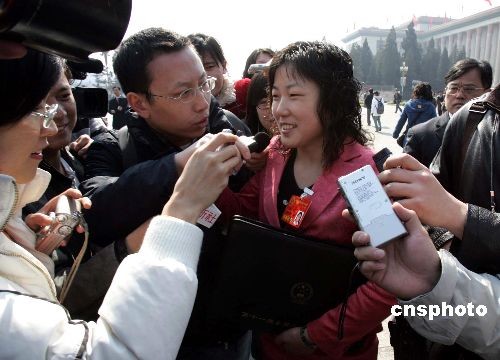 三月五日上午,打扮時髦的上海農民工人大代表朱雪芹,出席在北京人民大會堂舉行的十一屆全國人大一次會議開幕會時,成為媒體記者采訪的焦點。中新社發 潘索菲 攝