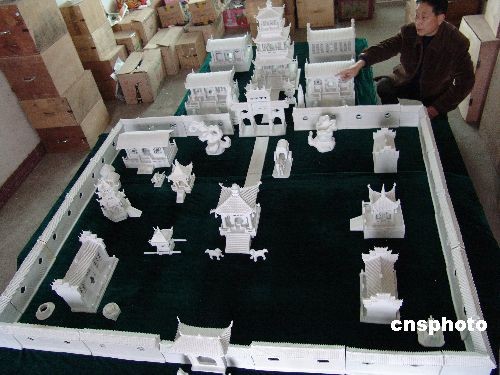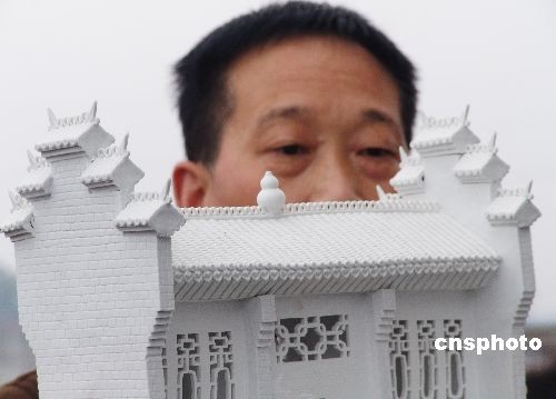 3月8日,江西省景德鎮羅冬根展示作品瓷器群雕《大觀園》。景德鎮陶藝家羅冬根用6年的時間,制作出面積達80平方米,主件有300多件的瓷器群雕作品《大觀園》。這部作品由建筑、園林、山水、民俗等部分組成,采用高白泥澀胎瓷制成,取題于《紅樓夢》大觀園,取材于蘇州園林和江南徽派建筑。中新社發 石衛明 攝