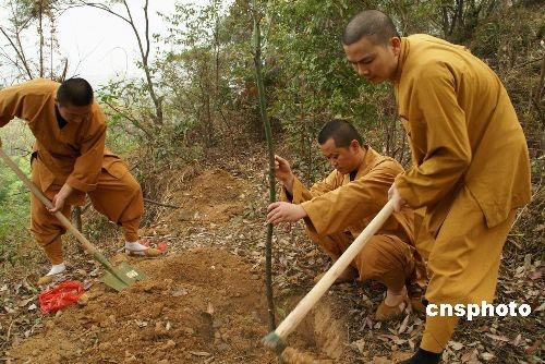 3月12日中國植樹節,廣東南海西樵山寶峰寺的僧侶在西樵山國家森林公園參加植樹造林。有珠江西岸文明燈塔之稱的廣東南海西樵山國家森林公園,經過多年植樹造林,森林覆蓋率已達到90%以上。中新社發 孫建駒 攝