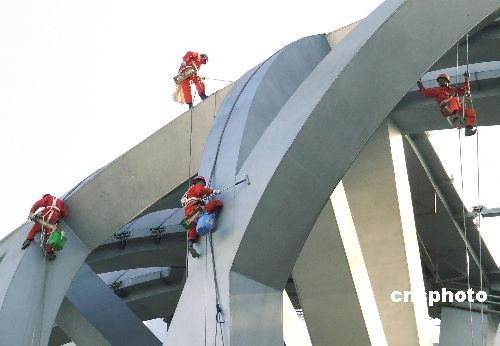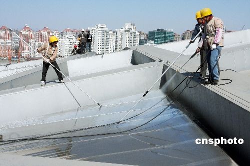3月13日,中國國家體育場“鳥巢”開始“洗臉美容”。據(jù)北京城建集團國家體育場工程總承包部消息,此次清洗是為了迎接4月中旬的“好運北京”測試賽。“鳥巢”膜結(jié)構(gòu)近92000平方米,在膜結(jié)構(gòu)清洗的同時還進行鋼結(jié)構(gòu)保潔。圖為工作人員正在對“鳥巢”進行鋼結(jié)構(gòu)保潔。中新社發(fā) 鄭雄增 攝
