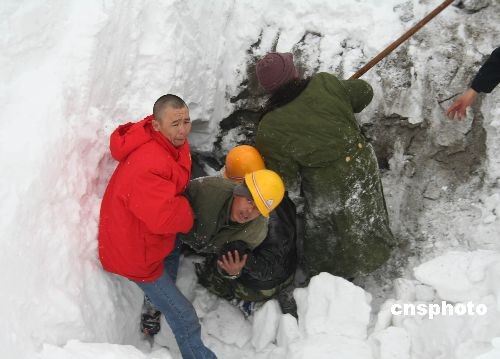 3月13日上午11點20分左右,位于新疆天山果子溝的西氣東輸二線工程一處隧道施工現場發生雪崩,目前已知有6名被困在隧道內的工人獲救。由于隧道口被大雪掩埋,被困人數不詳,搜救工作仍在持續中。圖為現場救援人員救出一名被困工人。中新社發 馬耀林 攝
