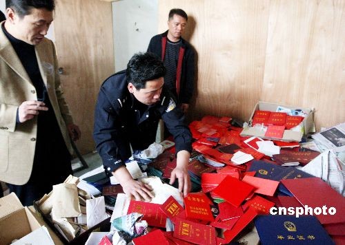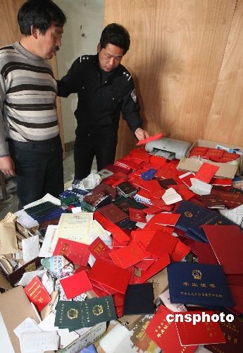 3月19日,河南洛陽警方在一民宅內(nèi)將一伙制造假證的犯罪集團(tuán)逮個(gè)正著。行動(dòng)中查獲各類假證7大類145種共計(jì)10000多份,現(xiàn)場還查獲印章、鋼印、電腦、打印機(jī)等一批制假造假設(shè)備。在事實(shí)面前,犯罪嫌疑人對(duì)犯罪事實(shí)供認(rèn)不諱。中新社發(fā) 曾憲平 攝