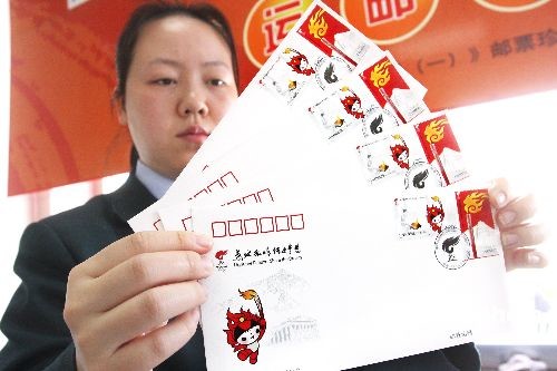3月24日9時,2008年首套奧運郵票《第29屆奧林匹克運動會---火炬接力》正式發行。圖為北京百萬莊郵局工作人員正在展示《第29屆奧林匹克運動會——火炬接力》紀念郵品。中新社發 鄭雄增 攝