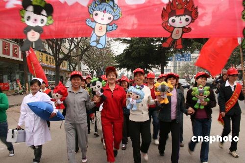 4月7日,河南南陽市臥龍區60多位社區大媽以慢跑形式,迎接北京奧運會。本次名為“春暖花開迎奧運”的慢跑活動,總路程為五公里,大媽們以飽滿的精神、驕健的步伐充分釋放喜迎奧運的激動心情。中新社發 付海厚 攝