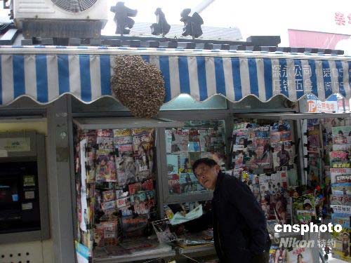 4月13日,蘇州人民路上一家信息亭的遮陽棚上聚集了大量的黃蜂,嚇得路人躲而避之。據悉,當日中午12點左右遮陽棚上還只是幾只黃蜂,后來越積越多,至下午5時左右已形成一個巨大的黃蜂窩,蜂窩直徑達40厘米,厚度也達4厘米,晚上9時左右黃蜂窩被消防官兵成功摘除。據行家分析,其原因可能是中午蜂王停在了信息亭的遮陽棚上,才引來大量的黃蜂聚集在了一起。中新社發 王建康 攝