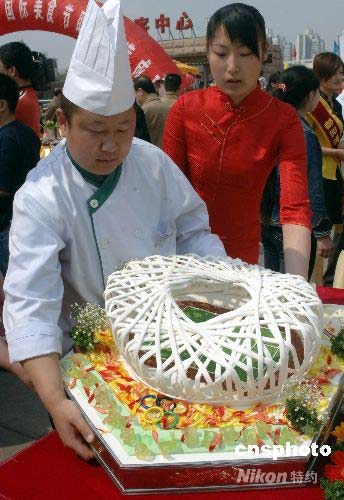 2000年4月24日,北京中央電視塔廣場(chǎng),第六屆中關(guān)村國(guó)際美食節(jié)開(kāi)幕式在此隆重開(kāi)幕。飲食企業(yè)和社團(tuán)派出精兵強(qiáng)將,在“綠色餐飲.奧運(yùn)美食”流行經(jīng)典菜式的展示活動(dòng)中展示自家拿手的菜肴。圖為一家餐廳展示制作精良的美食制品《鳥(niǎo)巢》。中新社發(fā) 鄒憲 攝