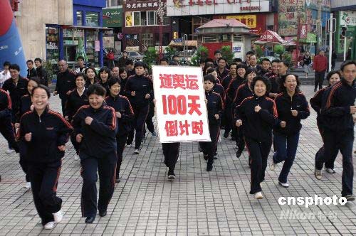 4月29日,新疆電影公司50余名職工手舉“迎奧運100天倒計時”牌匾,在新疆烏魯木齊市街頭舉行長跑活動。同時,為期5天的趣味運動會也拉開帷幕,其中包括長跑、踩氣球、乒乓球等項目,為即將到來的北京奧運會吶喊助威。中新社發 劉新 攝