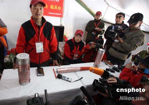 4月30日,受邀采訪2008北京奧運會火炬接力珠峰展示活動的中外媒體記者,集體在珠峰大本營探營。中國航天科工集團北京奧運火炬研發部有關負責人,向中外媒體揭秘奧運火炬接力珠峰展示活動所使用的珠峰火種燈、珠峰火炬、珠峰引火器。中新社發 盛佳鵬 攝