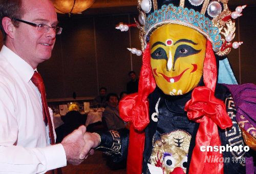 5月6日晚,在北京舉行的中外商貿合作項目洽談酒會上,來自四川的著名變臉藝人為嘉賓現場進行精彩的“變臉”,表演受到在座外國賓客的熱烈歡迎。中新社發 錢興強 攝