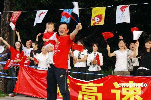 5月8日,奧運火炬接力傳遞將在深圳舉行,深圳市民紛紛涌向街頭為奧運火炬傳遞吶喊助威。中新社發 陳文 攝