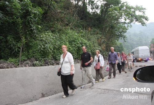 5月12日14時28分,在四川汶川縣(北緯31度,東經103.4度)發生7.8級地震。都江堰至汶川路段的水井灣大橋,發生約一百米寬的山體滑坡,已導致都江堰至汶川路段完全中斷,不少游客徒步數小時向都江堰方向前行,其中包括一些外國游客。中新社發 黃榮 攝