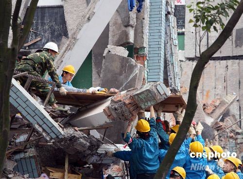 5月13日中午,四川省綿竹市漢旺鎮東方汽輪機廠子弟學校——東汽中學的垮塌校舍里,被困近一天的學生被救出。12日,四川汶川縣發生7.8級地震,而漢旺鎮與汶川僅一山之隔,距離30余公里,受到嚴重破壞。中新社發 郭晉嘉 攝