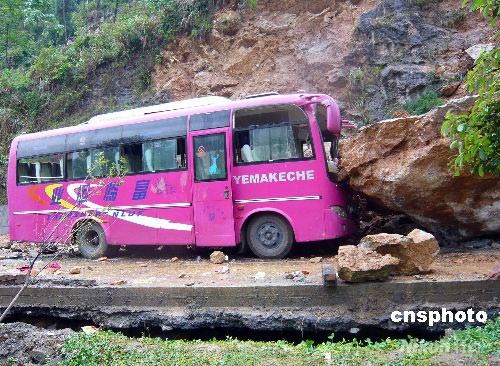 5月13日,通往四川省北川縣的公路已分層變形,一輛被巖石擊中的大巴車車頭嚴重變形。12日的地震在該路段引起多處山體滑坡,不少車輛被滾石擊中。中新社發(fā) 杜遠 攝