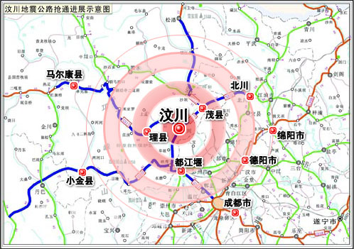 據(jù)來自交通運輸部的消息,目前,四川省內所有高速公路均已恢復正常通行,成都、德陽、綿陽、雅安等受災地區(qū)的主要干線公路也已搶通。但都江堰至汶川、理縣至汶川、茂縣至汶川、臥龍和映秀至汶川的公路損毀極為嚴重,交通部門正同時從東西南北四個方向全力搶通前往汶川的受損公路。