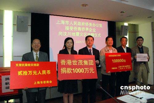5月14日上午,上海僑商僑界企業向汶川地震災區捐款一千萬余元。其中,上海市僑商會會長、世茂集團董事長許榮茂先生以世茂集團名義向災區抗震救災捐款1000萬元幫助災區人民度過難關。在上海僑辦舉行的接受僑商僑界企業向災區捐贈儀式上,僑辦領導以及機關全體工作人員也向災區紛紛捐款。中新社發 王江紅 攝