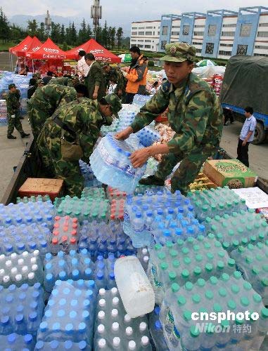 5月14日,四川都江堰市郊的臨時救災物資集散中心,堆積如山的物資通過組織部門和志愿者、支援車輛向各災區發放,盡快送到災民手中。一些郊區農民自己將熱飯送進市區災民手中。中新社發 周青先 攝