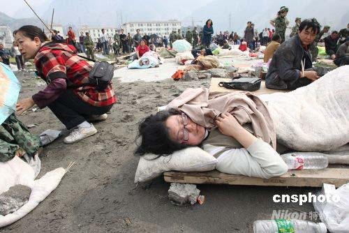 5月15日,等待救助的汶川縣災民。由于陸路交通尚未恢復,重傷員只能等待直升機轉運到成都救治。中新社發 張雷 攝