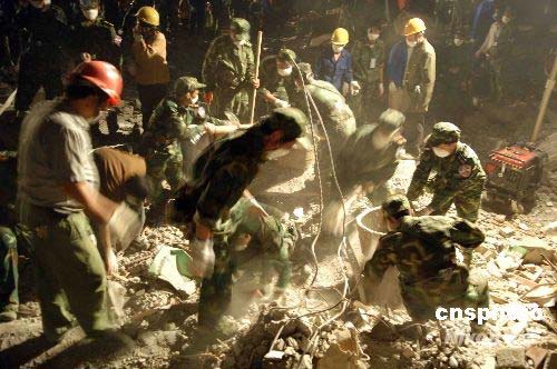 五月十五日深夜,由部隊、消防、民兵、志愿者組成的搶險隊分批進入地震重災區綿陽北川中學,在廢墟里搜救被困的師生,發現多個罹難中學生的遺體。中新社發 陳文 攝