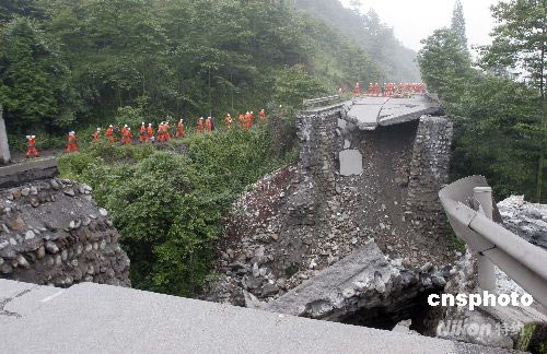 5月15日,河南省消防總隊抗震救災突擊隊在公路斷行的情況下,攜帶專業(yè)救援設備步行向地震重災區(qū)什邡市紅白鎮(zhèn)進發(fā)。中新社發(fā) 張曉理 攝