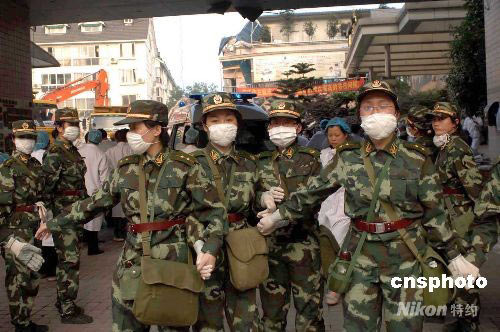 2008年5月15日,四川汶川7.8級地震災區都江堰市危樓排險工作在進行中。圖為江堰市一抗震搶險區大門前,武警女兵對救災現場進行保衛工作。中新社發 鄒憲 攝