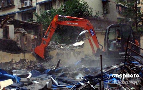 2008年5月15日,來自成都市企業的志愿抗震救災隊伍攜帶大型機械車輛開到都江堰市區,幫助展開危樓居民區的排險、救災、防疫工作。汶川7.8級地震,給都江堰市帶來巨大破壞,目前危樓居民疏散、安置工作已展開,取得一定成果。中新社發 鄒憲 攝