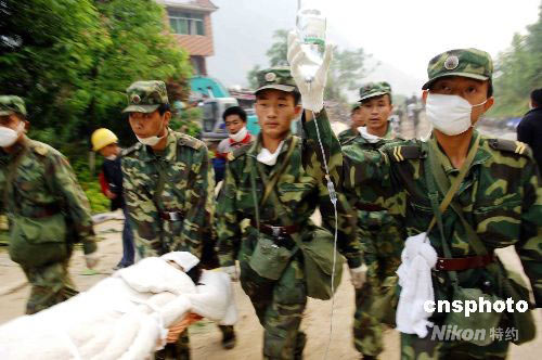 五月十六日晨,解放軍某部官兵在地震重災(zāi)區(qū)北川縣茅壩小學(xué)搜救出三名小學(xué)生,這已是地震災(zāi)難進(jìn)入第五天在廢墟里搜救出的幸存者。中新社發(fā) 陳文 攝