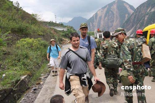 5月14日,從都江堰到汶川縣映秀鎮沿線民房和交通受損嚴重,許多受困的居民紛紛離家趕往安全地點,也有許多居民想回家看往地震區的親人。圖為受困的外國游客在前往安全地點的途中。中新社發 黃榮 攝